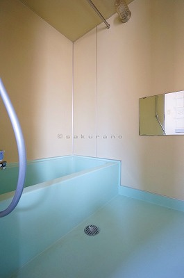 ライトブルーの浴槽がレトロポップな印象を与えるバスルーム。